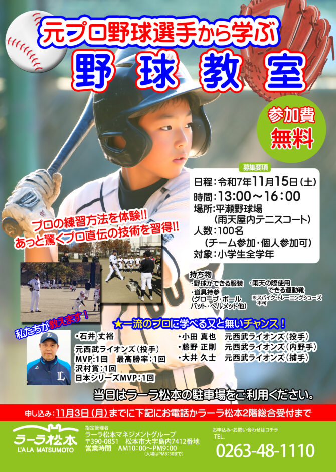 • 【イベント】元プロ野球選手から学ぶ 野球教室開催のお知らせ
